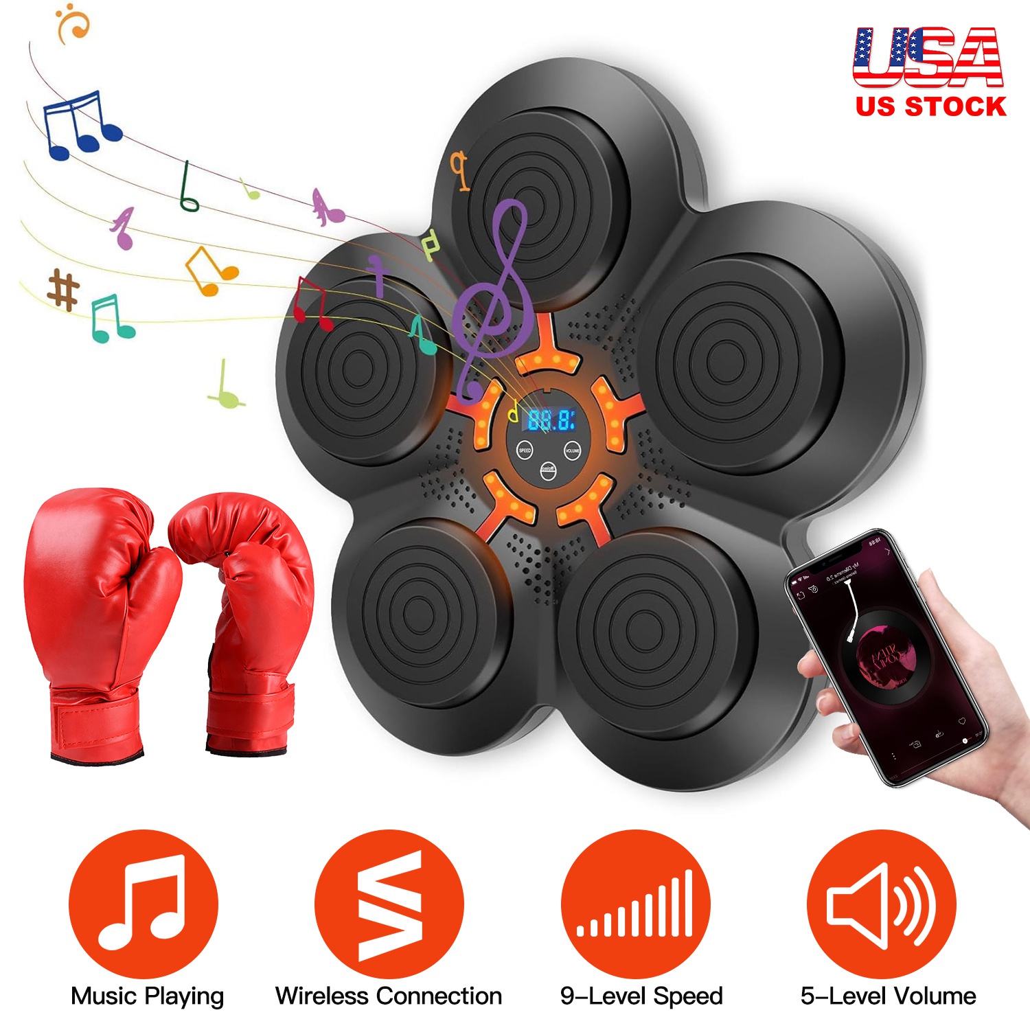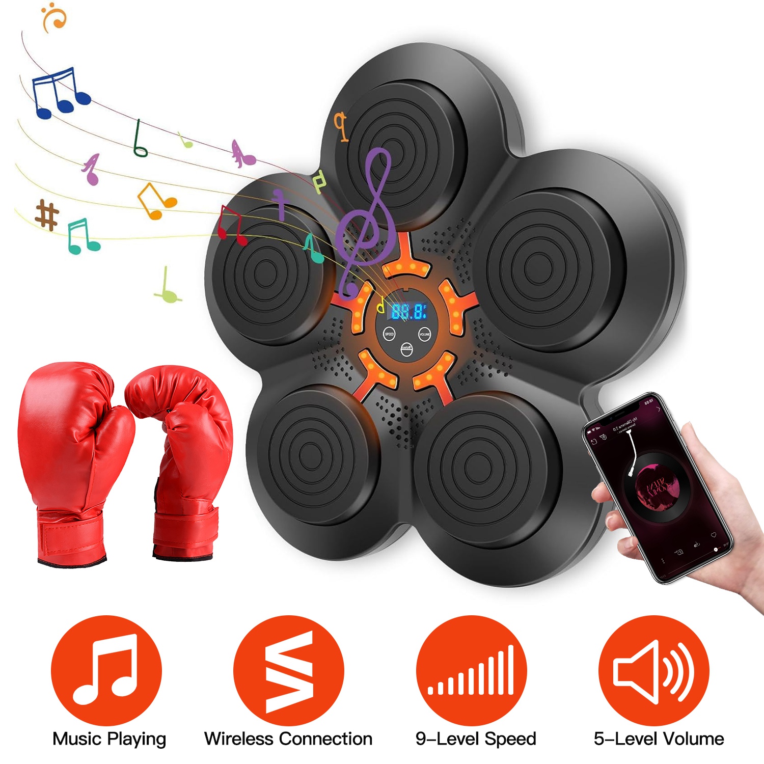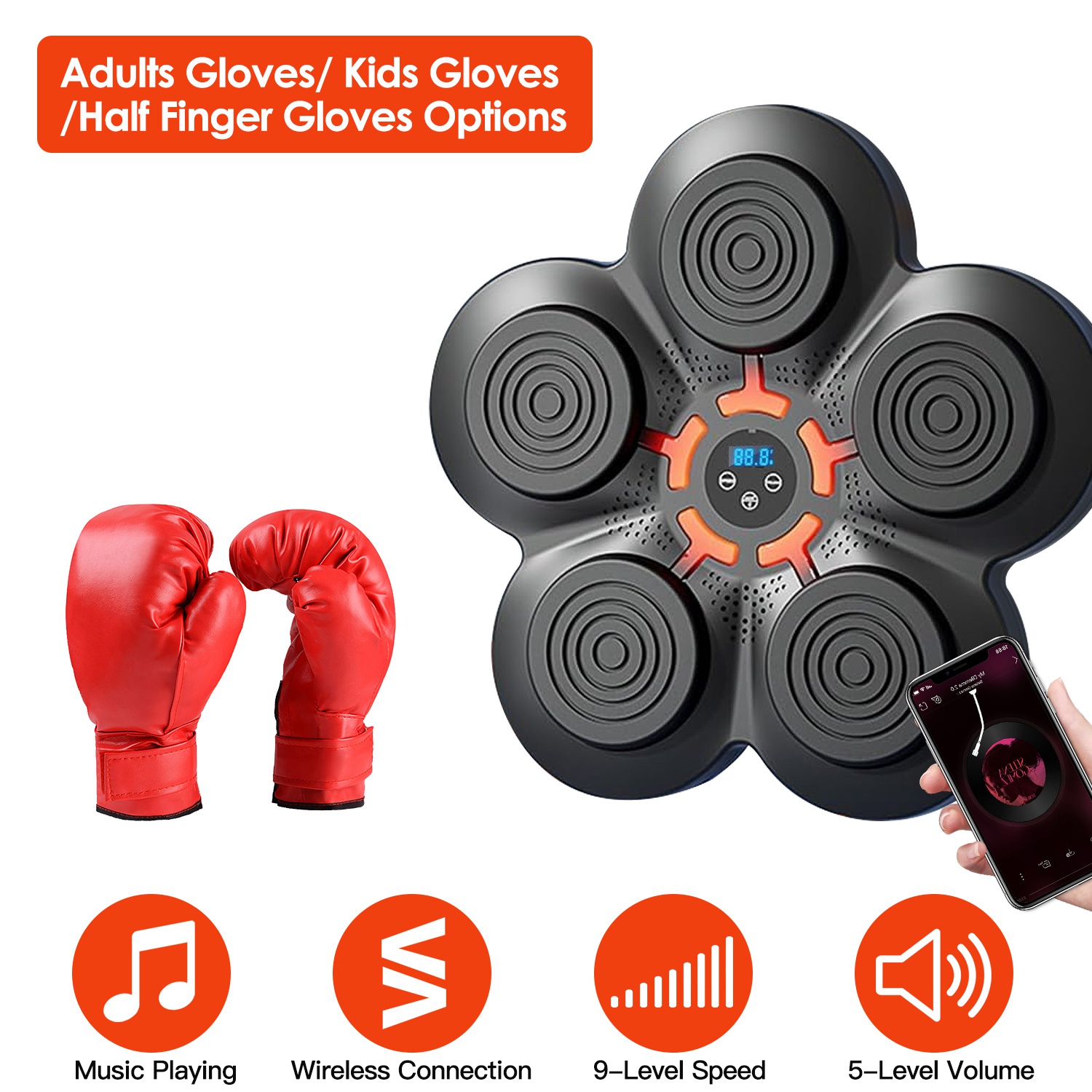 It's a portable compact but efficient and fun boxing equipment. Designed with jumping red light to improve your reaction speed, endurance, or help you keep fit or lose weight. You can adjust 9 levels of speeds, suitable for both novices and boxers, both kids and adults. Wireless connecting mode allows you to play the music you like while boxing, greatly enhancing your experience and having more fun. Just stick the hook&loop strip on the wall and paste the machine, then you can enjoy the boxing fun. We also provide you with a pair of gloves for using. Adults/Kids/Half Finger Gloves can be chosen according to your needs.