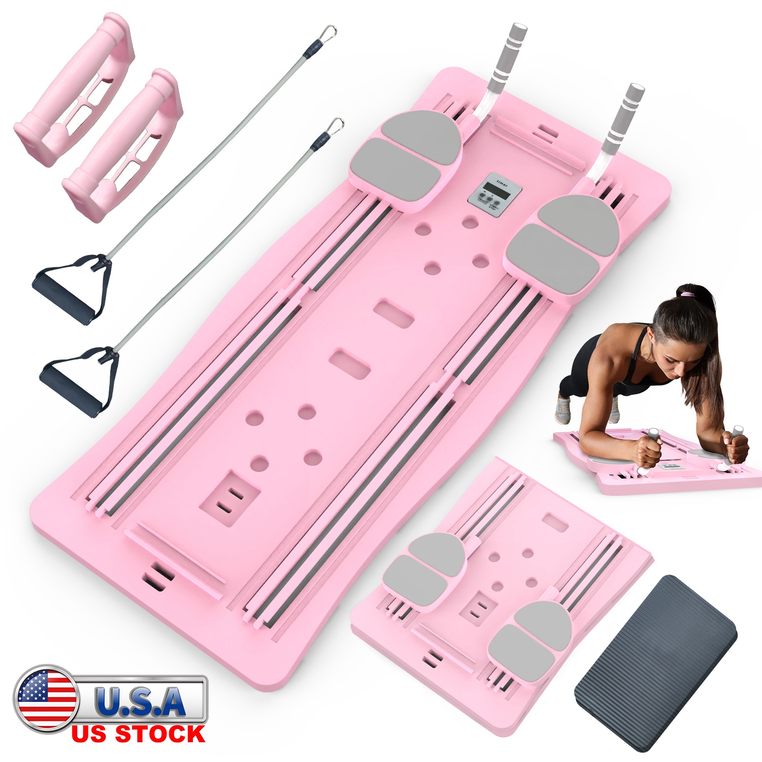 From sliding board exercises to resistance band workouts, this Pilates reformer functions as an Ab wheel, plank board, resistance bands and push-up bars, targeting training of your core, arms, legs, and back etc.. Built in a timer and phone holder to keep you motivated. Sturdy enough to hold up to 330lbs weight. Provide a kneel pad, non-slip elbow pads, bottom foot pads, ergonomic hand grips to keep you comfortable and safe. Foldable and easy to assemble. An ideal gift for people who loves working out!