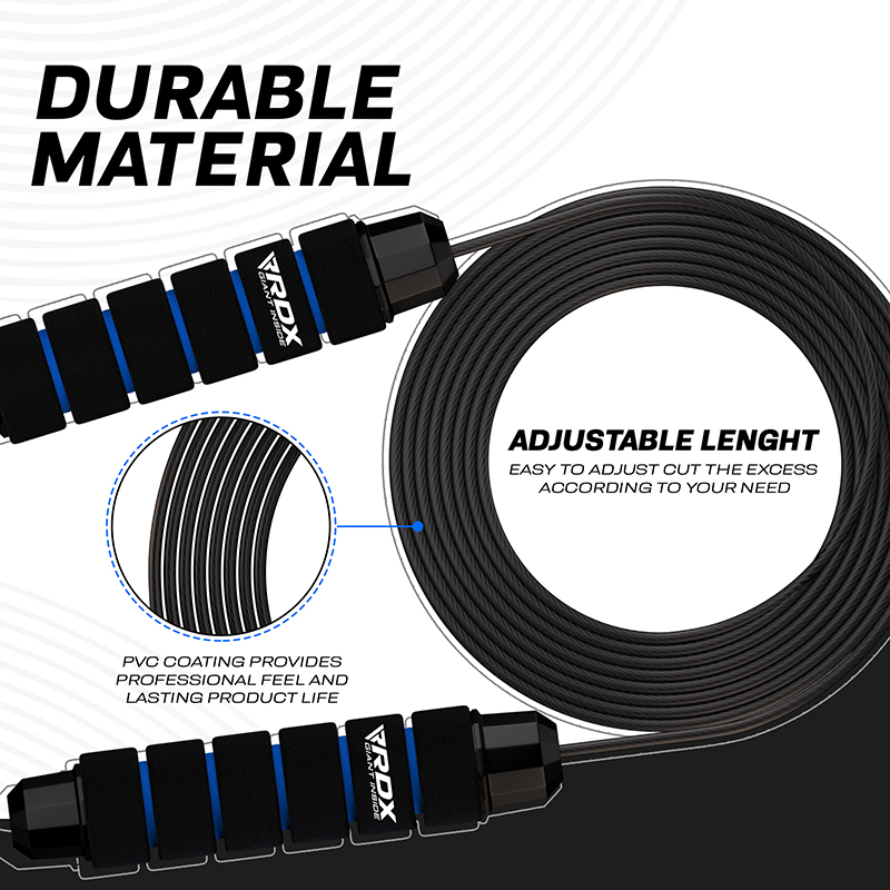 Why splurge on bulky home gym systems when you can get the complete gym experience with just the essential home gym equipment. Integrate the RDX weighted jump rope with memory foam handles into your routine to increase the intensity of workouts and to perform cardio anywhere, anytime. Manufactured from premium quality materials for professional feel and long-lasting performance. The durable PVC coated cable wire can sustain rough outdoors use against concrete pavements or collision against indoors wooden floor without damaging the internal steel cable. Equipped with non-slip, soft memory foam handles the weighted rope fits comfortably in hands for a pain-free skipping experience. Special grip-enhancing silicon handlebar rings prevent slippage and ensure a firm grip even in sweaty hands. Removable weights in handles allow users to adjust the additional resistance to your jumps. This makes the heavy jump rope equally suitable for beginners working out in their garage, and pros training for XFit or Decathlon. Adjustable 10.3 ft length cable allows users of different sizes to modify the rope according to their height. Comes with its own antimicrobial pouch and comprehensive workout guide to ensure you train properly even when you're away from the gym. Choose from red, blue and green colour options to make your workouts even more vibrant.